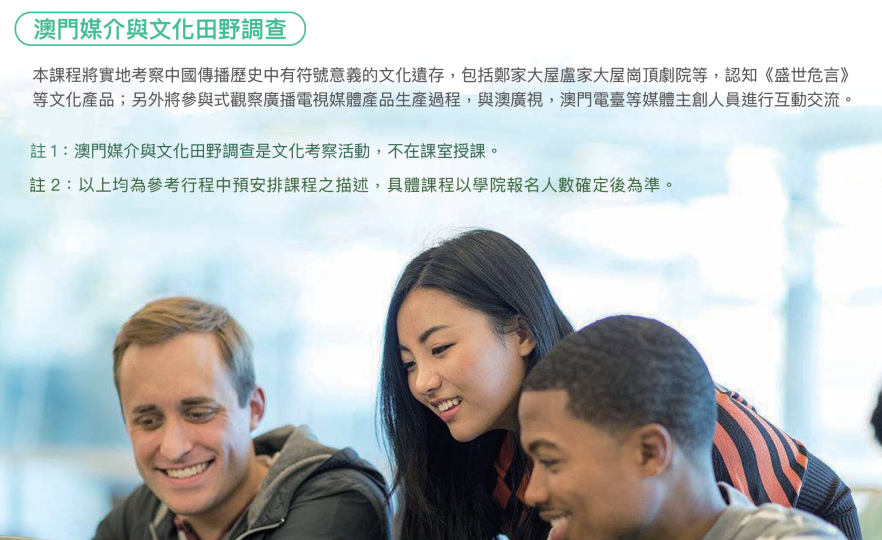 双方多次讨论和修改访学的课程设置和搭配的活动,为川外的学生,特别是新传学生,进行定制化改造,可以说是量身定制。比如,访学活动的讲座包括“视觉传播”、“跨文化传播传播”、“公共关系的影像故事”、“策划与创意策略”,以及“澳门媒介与文化田野调查”等(具体的内容介绍可在本文后面的PDF文档中查看)。