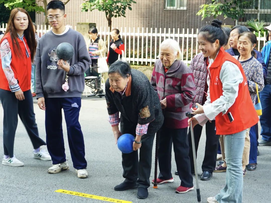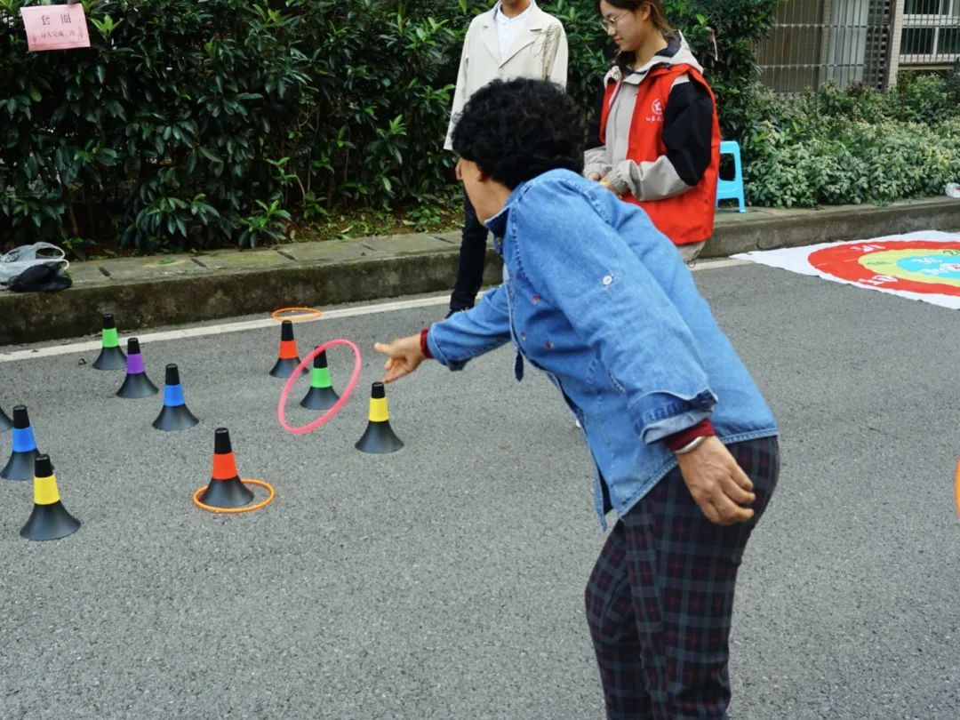 在另一边的“邻里节”游园活动好不热闹,套圈、丢沙包、射门、保龄球4个游戏项目欢快地进行着。每个项目区域都排起了长队,老人们玩得不亦乐乎,现场一片欢声笑语,呈现出浓厚的节日氛围。