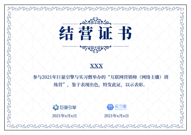 4.通过项目考试可申请“巨量引擎数字营销职业能力认证——互联网营销师:网络主播(初级)”证书。