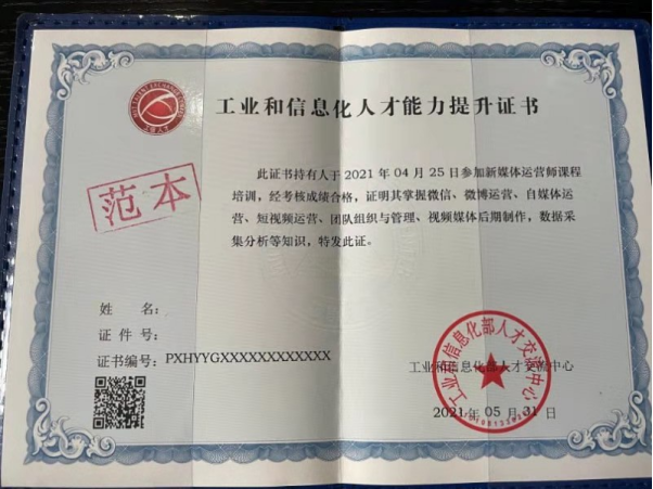 1.通过项目考核可申请工业和信息化部颁发的“工业和信息化部人才能力提升证书——新媒体运营师”证书。