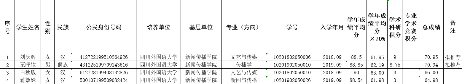 根据“关于做好我校2020年研究生国家奖学金评选工作的通知”、四川外国语大学关于印发《四川外国语大学研究生国家奖学金管理暂行办法(修订)》的通知(川外办发〔2017〕64号)等文件精神,经我院研究生国家奖学金评审委员会初评,拟确定刘庆辉、粟晖钦2人作为44118太阳成tyc城集团2020年研究生国家奖学金初评推荐人选。(公示名单见附件)