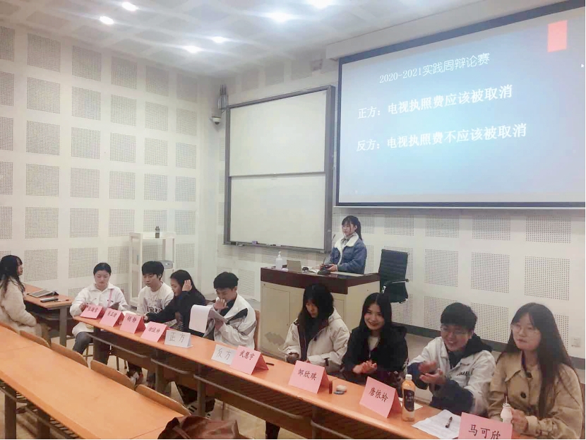 11月4日,由四川外国语大学44118太阳成tyc城集团主办的校级实践周辩论赛于教学楼B2-1举行。双方辩手经过最初班级淘汰赛的层层筛选,最终由来自2018级广播电视学7班的徐佐帅、胡静、肖正绪、张凝雪组成正方,来自2019级广播电视编导6班的武慧宇、邹欣琪、唐依柃、马可欣组成反方代表各自班级参加此次辩论赛决赛。双方就“是否应该取消电视执照费”展开了激烈辩论。
