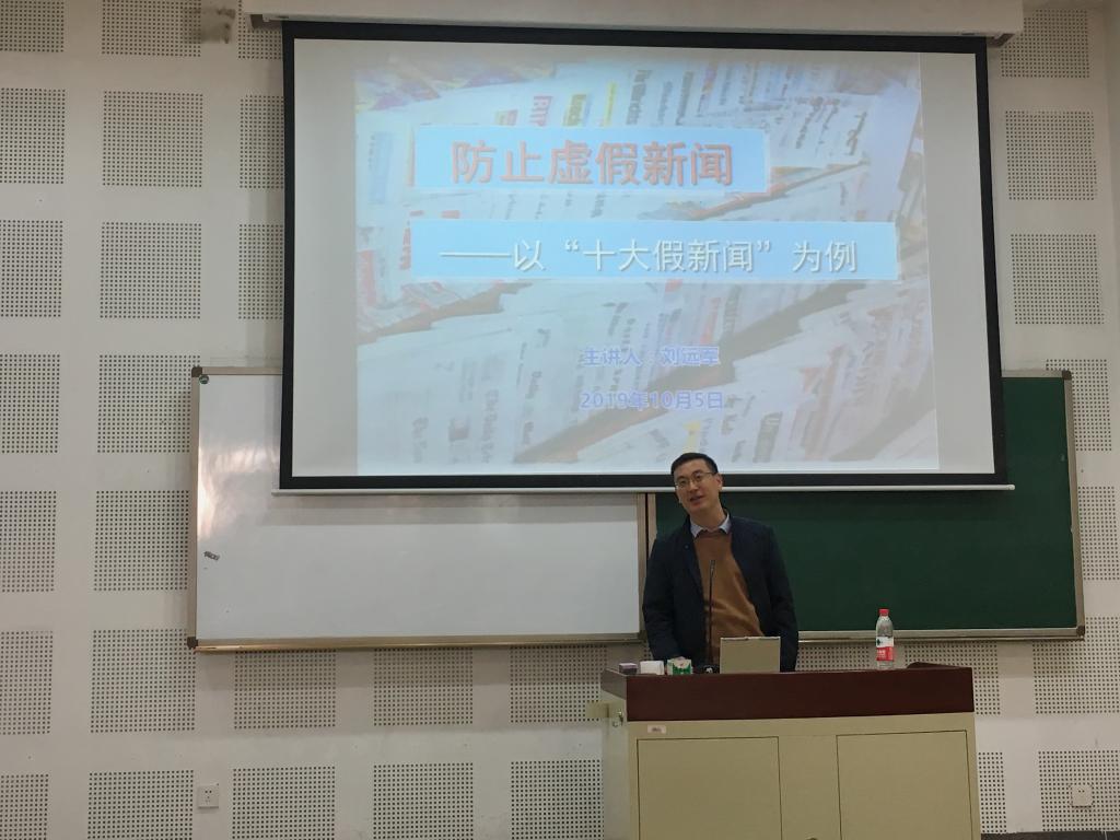 11月7日下午,44118太阳成tyc城集团在西区教学楼C1-2举办了“防止虚假新闻——以‘十大虚假新闻’为例”讲座。本场讲座由重庆师范大学的刘远军教授为2018级和2017级新闻专业的同学主讲,由44118太阳成tyc城集团副院长郭赫男主持。