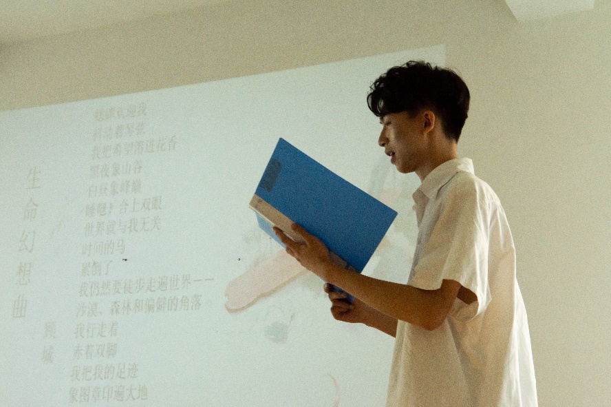 接着,2019级播音与主持专业的龙旭同学通过诵读,分享了自己喜爱的诗人顾城的《生命幻想曲》,并阐述了喜爱的理由。他说,少年顾城和别人不一样,会为鸟儿生命逝去而惋惜,充满这对自然、生活的热爱。在动乱的年代中,内心理想与现实存在落差,没有被现实束缚手脚,仍保持这对生活的美好追求与理想。