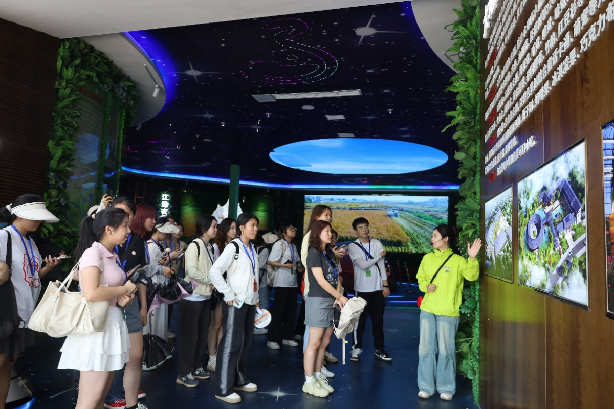 老师和同学们还在馆内梯田进行了插秧体验。在指导老师何永龙讲解了插秧的具体步骤后,师生们便挽起袖子、裤脚,踩进泥田,插起了秧苗。在欢声笑语中,一株株秧苗整齐地插入泥土中。