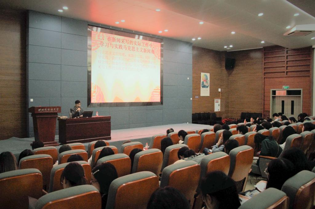 邱沛篁教授在讲座上就如何以马克思主义新闻观为指导做好新闻采写工作”问题进行了讲解。邱沛篁教授着重强调了新闻采写工作必须遵循“真、短、快、活、强”五字真言的要义。他指出,新闻采写工作既是新闻实务的一部分,同时也是一名记者业务水平与个人素养的综合体现,只有将其当成一门学问、一项艺术来对待,才能真正做好新闻采写工作。