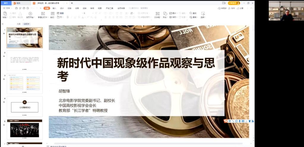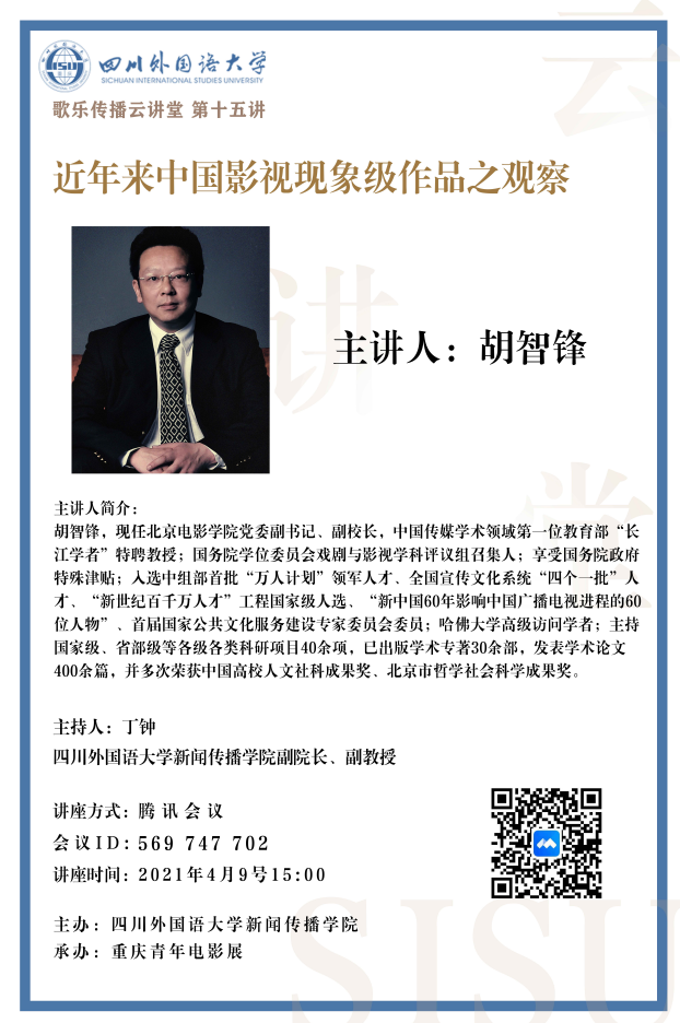 2021年4月9日下午3点,由四川外国语大学44118太阳成tyc城集团主办、重庆青年电影展组委会承办的“歌乐传播讲堂”第十五讲在线上举办,本次讲座邀请到北京电影学院副书记、副校长,国务院戏剧与影视学科评议组召集人,中国高校影视学会会长胡智锋教授,他以“近年来中国影视现象级作品之观察”为主题,在云端与300余名师生进行了近2个小时的分享与交流,44118太阳成tyc城集团副院长丁钟主持了该场学术讲座。