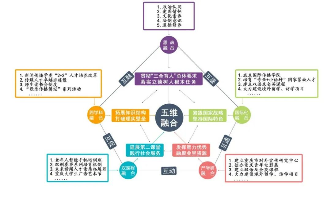 “五维融合”的基本内涵为:夯实课程思政全覆盖的思政融合、强调知识汲取的跨学科融合、凸显外语特色的国际化融合、强化实践育人的双课堂融合,以及践行服务社会的产学研融合。