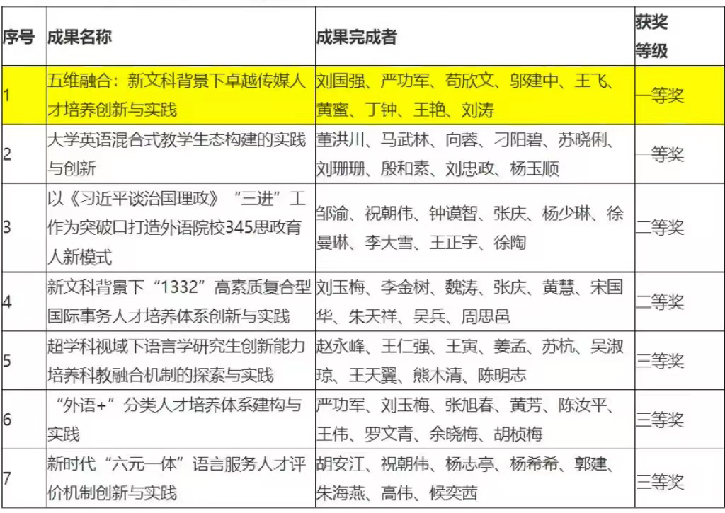 日前,《重庆市人民政府关于重庆市教学成果奖励的决定》(渝府发〔2022〕28号)印发,川外7项成果获得2021年重庆市高等教育教学成果奖,我院《五维融合:新文科背景下卓越传媒人才培养创新与实践》教学成果获一等奖。