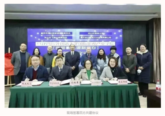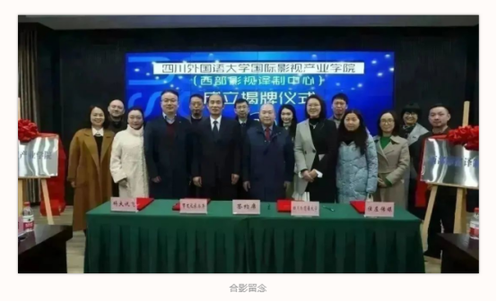 国际影视产业学院暨西部影视译制中心由重庆市文化和旅游发展委员会、四川外国语大学、科大讯飞股份有限公司以及重庆佳左影视文化传媒有限公司联合共建,是全国首家政校企三方共建的国际影视产业学院。