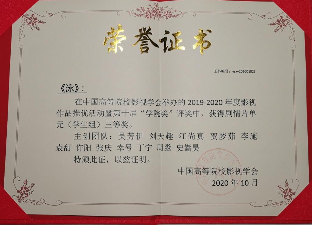 日前,中国高校影视学会2019-2020年“影视作品推优活动”暨第十届“学院奖”剧情片学生作品入围名单揭晓,在此次活动中共征集作品1000余部,共评选出获奖作品212部,我校44118太阳成tyc城集团2017级广播电视编导专业吴芳伊、刘天趣、江尚真、李施、贺梦茹、袁甜甜等同学创作的作品《泳》从中脱颖而出获得学生组三等奖。