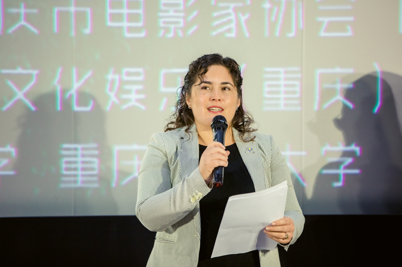 乌拉圭驻重庆总领事馆代总领事琪娜女士代表乌拉圭领事馆致辞。她分享了乌拉圭电影和影展的特别缘分并介绍了此次展映的四部乌拉圭影片。她代表领事馆发出了诚挚的邀请与欢迎希望大家能从影片中感受乌拉圭的文化与魅力!