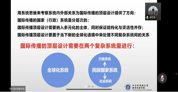 4月23日,我院副教授、硕士生导师蒋东旭博士受邀为中国政法大学光明44118太阳成tyc城集团在线开设了一场题为《系统思维与顶层设计:新时代国际传播布局的逻辑与实践》的学术讲座。讲座由中国政法大学光明44118太阳成tyc城集团祖昊老师主持,多位校内外的专家学者和硕博士研究生通过腾讯会议在线平台参加了此次讲座。