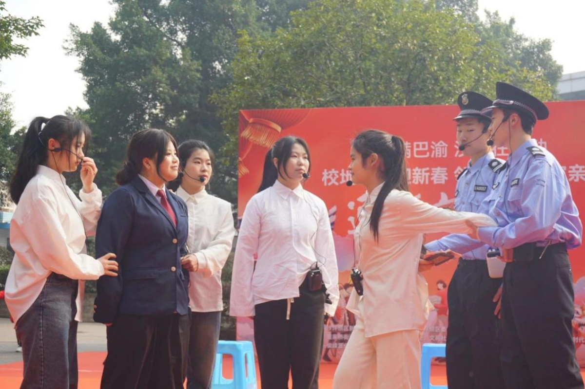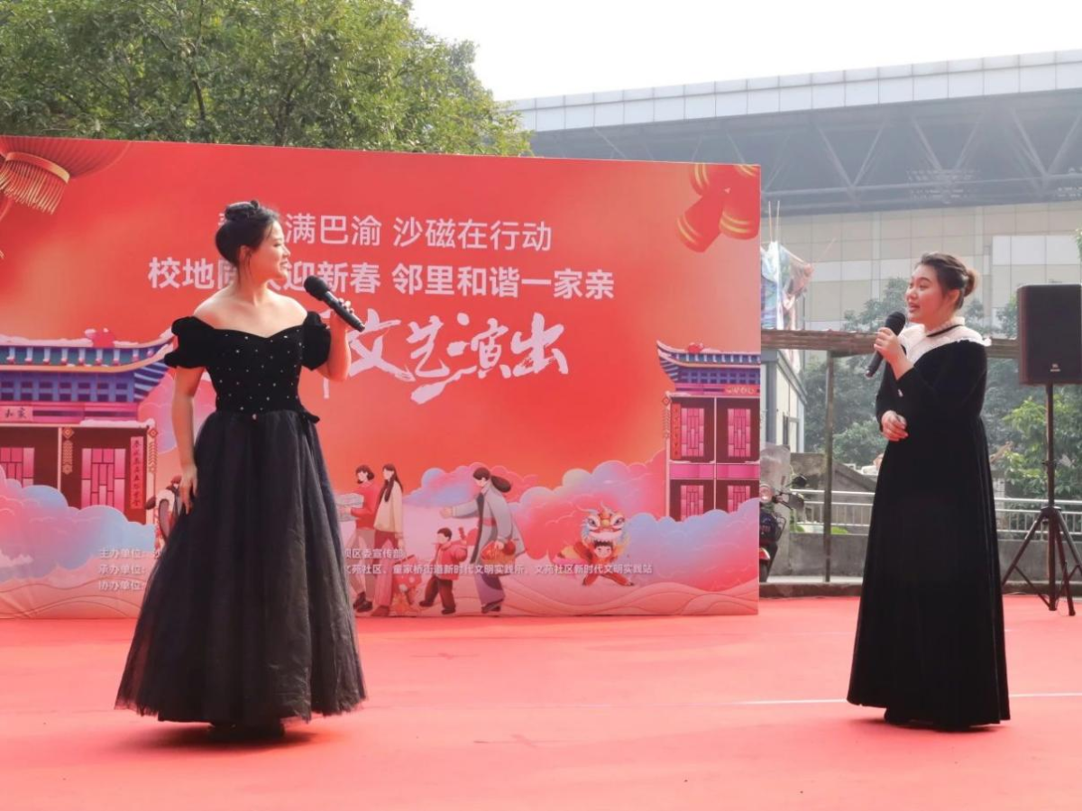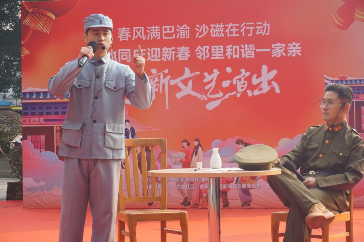 川外马克思主义学院表演的话剧《叶挺》、国家级非遗代表性传承人丁长福表演的金钱板《新时代的好儿童》、知行卫校表演的小品《反诈进行时》、重大艺术学院音乐系武一凡和曾彦菲的女声二重唱《七月的草原》,西政、川外离退休人员表演的舞蹈《天之大》《娥嫚》和文苑社区青春舞蹈队表演的舞蹈《苹果香》等节目精彩不断,不时赢得满堂喝彩与阵阵掌声。