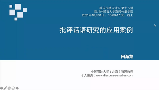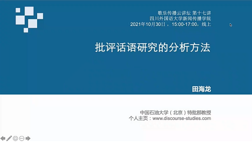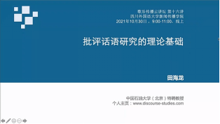 10月31日15:00,第三场开讲,田教授在前两场讲座内容基础上进一步深化,将关注的要点指向了批评话语研究的应用案例”。
