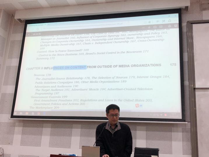 次日上午十点,由戴明老师主讲的关于新闻选择的导读会在歌乐楼A1-1教室开讲,这是本次实践周的最后一场导读会。戴明老师从“选择新闻的标准”出发,告诉同学们:“选择新闻就要选择有价值的新闻,能够引起社会关注的新闻,因为能引起社会关注的新闻往往对人类对世界产生影响。”随后,戴明老师向大家介绍了新闻选择标准有时效性、奇异性、显著性、关联性、接近性、人情味、对立冲突性的知识,后播放了两则视频,以强调作为新闻选择标准之一的“奇异性”。接着,戴明老师根据《大众传媒把关》这本书说明了新闻选择从理论层面上来说是“奇异性”和“社会意义”两个概念,并深入解释了“新闻影响中个体、例行实作、媒介组织、社会组织与媒体之间的关系以及社会体制这五个层次是新闻选择的核心”的结论。