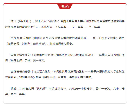 特等奖!第十八届“挑战杯”重庆市选拔赛新传获优秀成绩