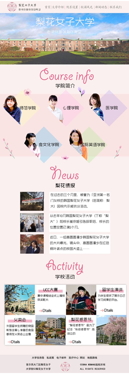 网站介绍:面向中国旅游观光客、有留学意向的学生及家长,为韩国梨花女子大学定制中文网站。